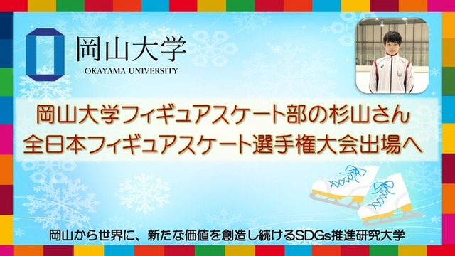 国立大学法人岡山大学(本部:岡山市北区、学長:槇野博史)のフィギュアスケート部の杉山匠海さん(グローバル・ディスカバリー・プログラム1年)が、2021年11月5日~6日にアクシオン福岡(福岡市)で開かれた第47回西日本フィギュアスケート選手権大会に出場し、男子シングルで第4位となり、12月に開かれる第90回全日本フィギュアスケート選手権大会への出場が決まりました。