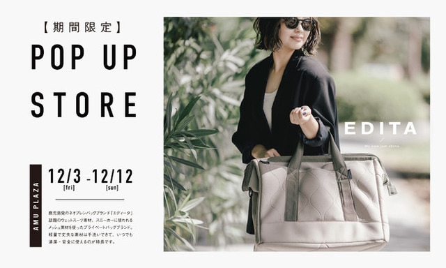 株式会社グランジー(鹿児島県 鹿児島市)は、2020年末より衛生習慣の高まりを受けEDITA(エディータ)をローンチした。帰宅後の新習慣として「バッグを洗うこと」を提案。普段はECショップをメインに展開となりますが、EDITA単独としては2回目のポップアップショップを鹿児島市のアミュプラザにて2021年12月3日(金) - 2021年12月12日(日)まで実施することを決定いたしました。期間中はクリスマスプレゼントラッピングなどお得な特典も多数ご用意。