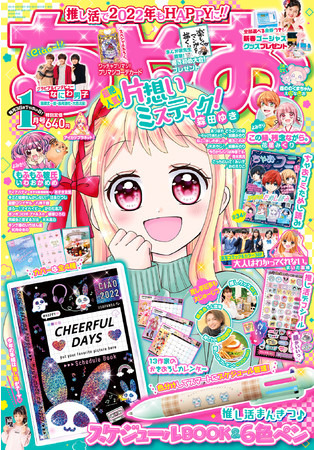 少女まんが誌15年連続部数No.1「ちゃお」(小学館)12月1日(水)ごろ発売の1月号のふろくは、みんなの推し活を応援する「CHEERFUL DAYS スケジュールブック」! 着せ替えカバーが4種類ついているから、お気に入りが選べちゃう。「願いを叶える6色ペン」「DAILY推し活 スケジュールシール2022」「13作家13か月フルカラーカレンダー」をフル活用して、365日幸せ推し活ライフを楽しもう!