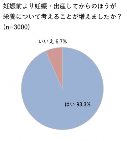 妊娠前より妊娠・出産してからのほうが栄養について考えることが増えたかという質問に対しては、93.3%が「はい」と回答し、妊娠・出産をきっかけに意識が大きくかわる傾向がみられました。