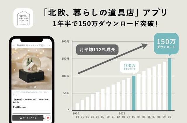 株式会社クラシコム(本社:東京都国立市、代表取締役:青木耕平)が提供するライフカルチャープラットフォーム「北欧、暮らしの道具店」のスマホアプリ(iOS・Android)が、2020年4月のAndroid版をiOS版に続いて提供開始してから、1年半で150万ダウンロードを突破しました。また、スマホアプリの提供開始前後で比較すると、年間売上が約1.7倍増の45.3億円に伸長し、現在は月間EC売上の56%がアプリ経由となった実績を合わせて発表いたします。