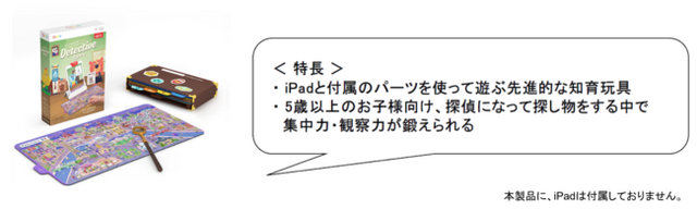 本製品は、iPadに専用のベースを装着し、付属するパーツを使って遊ぶ先進的なデジタル学習キットです。5歳以上のお子様向けで、探偵になってキャラクターの探し物を手伝う中で、遊びながら集中力や観察力を鍛えられます。難易度も設定できるので大人も一緒に楽しめます。