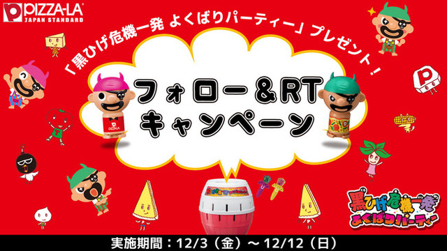 大変ご好評をいただきました発売記念のInstagramのピザーラ公式アカウント プレゼントキャンペーンに続き、第二弾として、「黒ひげ危機一発 よくばりパーティー」が当たるTwitterのピザーラ公式アカウント プレゼントキャンペーンを実施いたします。