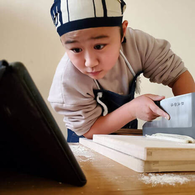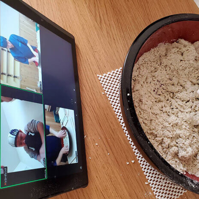 マイスターとZoom接続し、マイスターの手本を参考に、そば打ちの各工程を一緒に体験
