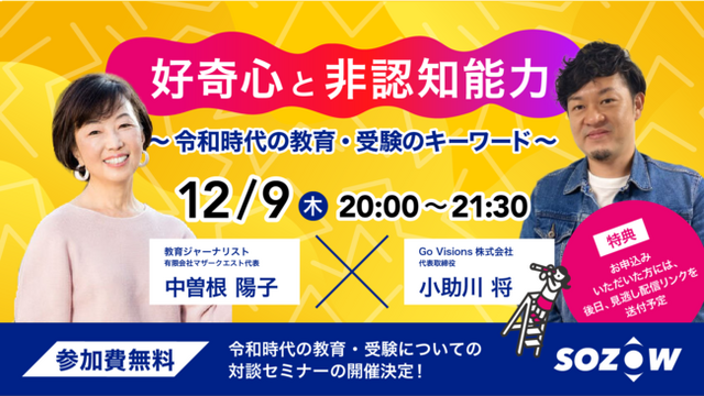 Go Visions株式会社(所在地:東京都品川区、代表取締役:小助川 将)が運営する小・中学生向けオンラインの学び場「SOZOW(ソーゾウ)」は、2021年12月9日に、代表小助川と教育ジャーナリストの中曽根陽子氏による対談イベント「好奇心と非認知能力 ~令和時代の教育・受験のキーワード~」を無料開催いたします。