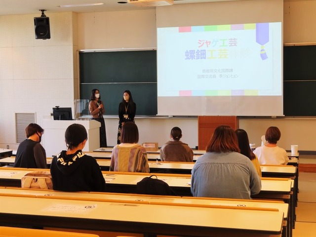 今回の体験会は、本学部の国際コミュニケーションコースで韓国語を学ぶ学生向けに、コロナ禍で留学や国際交流の機会が少ない中、韓国文化に対する理解を深めてもらうため、島根県国際交流員のイ・ジョンヒョンさんにご協力いただき、実施しました。