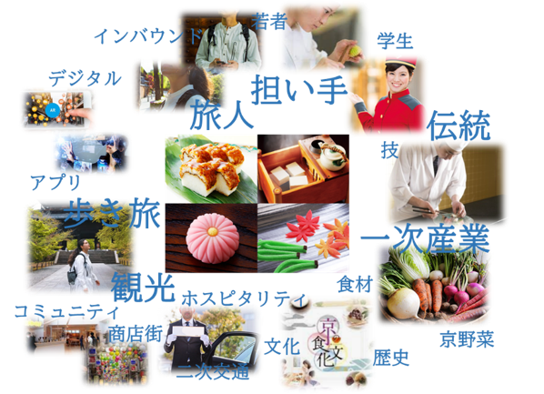 具体的には、学校法人大和学園を中心とした産官学の関係者が連携し、観光庁「既存観光拠点再生・高付加価値化推進事業:事業者連携型」の採択を受けて、京都の食を中心とした文化を五感で体感できる良事例ショーケースや実証実験を切り口に、長期的に様々な事業者が未来につなげる京都のブランドイメージの再構築を行います。