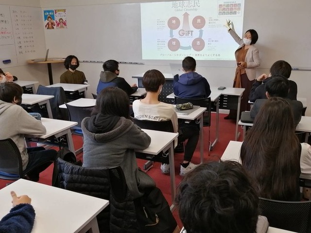 12月1日にはドルトン東京学園(東京都調布市)の中等部3年生約20人が受講しました。一般社団法人グローバル教育推進プロジェクト(GiFT)の辰野まどか代表理事がSDGsの達成には何が必要かについて話しました。達成がとても難しいが、実現すれば大きなインパクトがある挑戦という意味の「ムーンショット」の考え方が重要だと強調し、「今は『無理じゃないか』と思っても、その実現のために、まず自分がどう変わればいいかを考えてほしい」と助言しました。