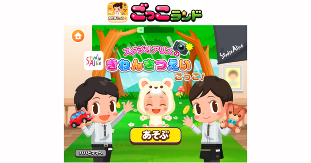 本ゲームを協賛する株式会社スタジオアリス(以下「スタジオアリス」)は、子どもたちの輝く笑顔の一瞬を美しく写真に残し、ご家族の「未来の宝もの」をお届けすることを使命とし、写真スタジオを全国で展開しています。今回、記念撮影の楽しさと、記念写真をフォトフレームや写真集の形で家族みんなで眺める時間の大切さ、喜びを子どもたちに感じてもらいたいという想いから、『ごっこランド』への出店が実現しました。