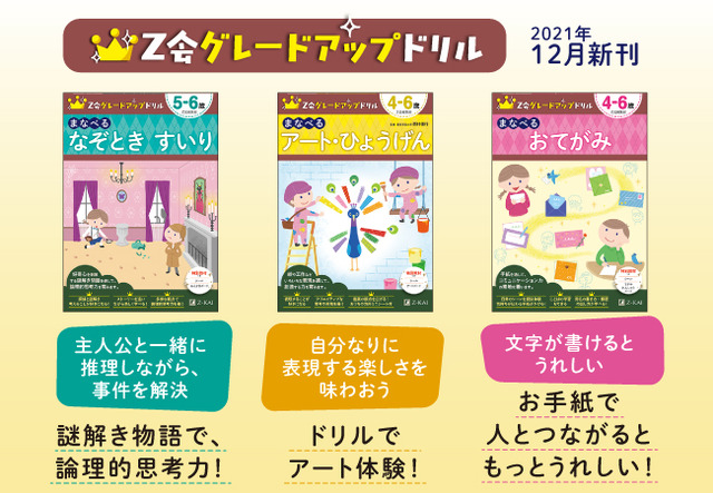 株式会社増進会ホールディングス(Z会グループ)のグループ会社、株式会社Z会ソリューションズは、幼児向けの学習ドリル『Z会グレードアップドリル まなべるシリーズ』から、「まなべる なぞとき すいり(5-6歳)」「まなべる アート・ひょうげん(4-6歳)」「まなべる おてがみ(4-6歳)」の3点を2021年12月7日に発刊。