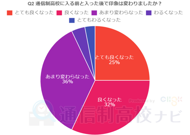 通信制高校の検索サイト「通信制高校ナビ(https://www.tsuushinsei-navi.com/)」を運営する、株式会社クリスク(東京都品川区、代表取締役社長:山下典久)が、通信制高校に通っている・在籍していた・卒業した方、その保護者の方100名を対象に、通信制高校への入学前後の印象変化に関する実態調査を行いました。