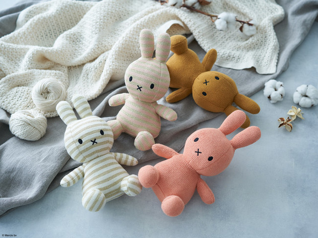 今回発売する新商品『Organic Cotton Collection』は、使用する原料から加工方法、労働条件まで、生産にまつわるすべての規定をクリアした安全で公正な製品にのみ与えられる「オーガニック・テキスタイル世界基準(GOTS)」の認証を受けたオーガニックコットンを使用したミッフィー。オーガニックコットンの生産が盛んなインドでつくられた本商品は、品のある優しい編目も特徴で、BON TON TOYSのなかでも特になめらかな触り心地を実現しました。オーガニックコットンらしい落ち着きと新しさを兼ね備えたカラーリングの Peach / Fudge、ラメ入りのストライプ柄が華やかな Stripe Cream / Stripe Pink、どれも季節を問わないカラーリングと素材感で、日常に寄り添ってくれることでしょう。生産からこだわりの詰まったこのアイテムは安全面において信頼できる基準を満たしているため、小さな赤ちゃんがいるご家庭をはじめ、お子様の成長とともにつれ添える飽きのこないデザインが、贈り物にも最適な商品となっております。また、環境、人、動物すべてに負担をかけない、地球の未来に優しく持続可能なものづくりを生活に取り入れたいかたにもお勧めの商品です。