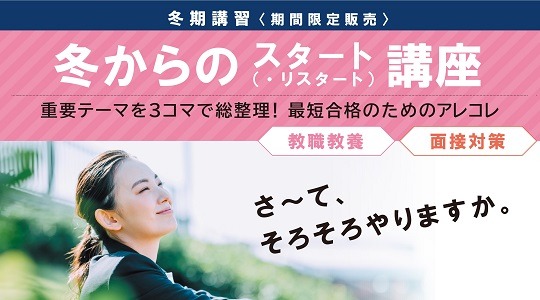 資格取得に向けた教育サービスを展開しているTAC株式会社(東京都千代田区、代表取締役社長:多田 敏男)では、教員採用試験を受験される方に向けた「冬からのスタート(・リスタート)講座」を、2021年12月13日より開講します。