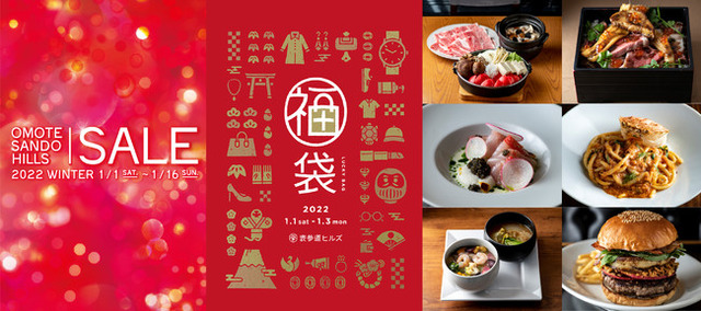 表参道ヒルズでは元日から16 日(日)までの16日間、「OMOTESANDO HILLS SALE 2022 WINTER」と題した新春セールを開催。館内の人気店舗約50 店舗が参加し、今シーズンのトレンドアイテムを30~60%オフで販売します。また、正月三が日には館内25店舗で福袋をご用意します。さらに、2021年12月27日(月)から2022年1月16日(日)までの間、館内10店舗の飲食店では「極上MENU」と題した普段なかなか味わえない「キャビア」「トリュフ」「フォアグラ」などの高級食材を使った特別メニューをご用意しています。