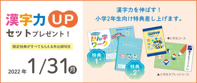 Z会の通信教育では、2022年度小学2年生向けコースにご入会いただいた方に「漢字力UPセット」を差し上げるキャンペーンを【2021年11月29日(月)~2022年1月31日(月)】まで実施しています。