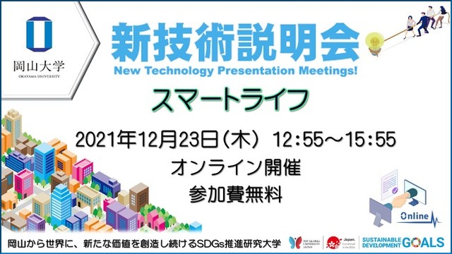 国立大学法人岡山大学(本部:岡山市北区、学長:槇野博史)と鳥取大学が共同事務局を務める、中国地域産学官連携コンソーシアム(さんさんコンソ)主催による「スマートライフ 新技術説明会」を、下記の通り開催いたします。