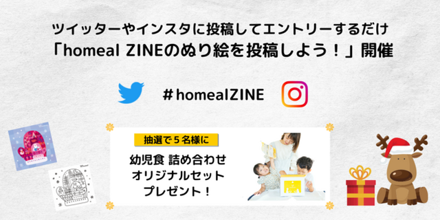 エントリーする際は、必ず「#homealZINE」を付けて投稿してください。また、お子さんのぬり絵についてのこだわりやコメント、お食事についてのお悩みなどをテキストに入力していただけると、当選の確率が上がるかもしれません。