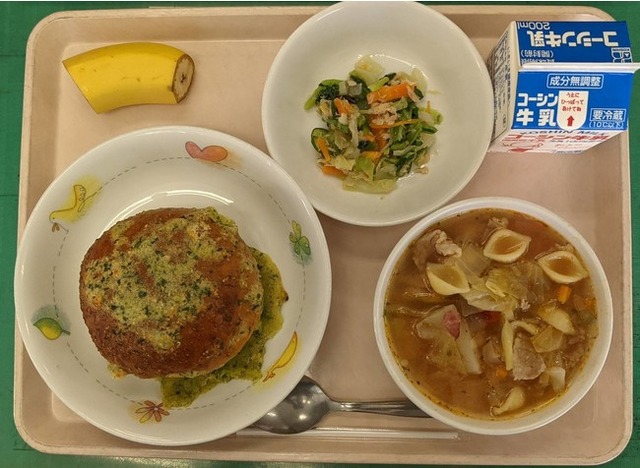 11月24日、江戸川区の「小松菜特別給食」の一斉提供の日、葉隠勇進が受託する2つ小学校も小松菜ビスキュイパンをはじめ、ピリ辛小松菜焼きそば、小松菜バナナケーキなどの献立を児童に提供しました。葉隠勇進の栄養士がそれぞれの小学校で工夫を凝らしたメニューです。