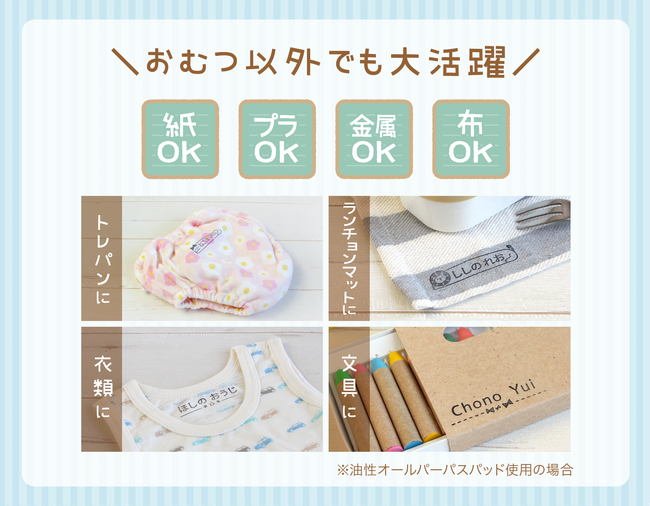 生地に押してそのまま洗濯することができるので、布オムツやトレーニングパンツ、パンツと段階に応じてお使いいただくことができます。さらに、ランチョンマット、お昼寝布団カバー、上靴袋など、大きめサイズの持ち物にもお使いいただけます。文具や食器にも押すことができ、食洗機にも対応しています。このスタンプ1本でさまざまなものに名前つけができます。