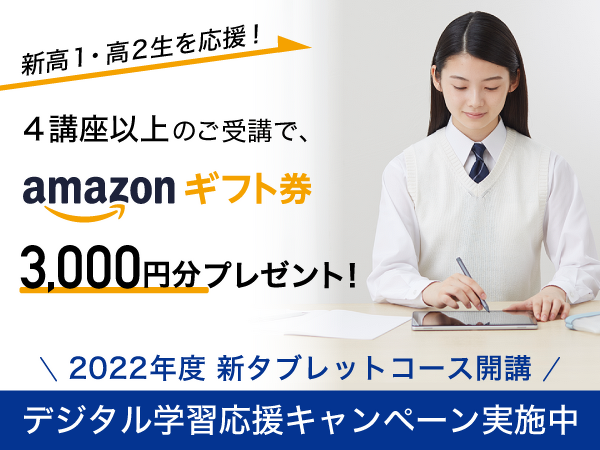 株式会社増進会ホールディングス(Z会グループ)のグループ会社である株式会社Z会は、「Z会の通信教育」高1・高2生向けの講座において、2022年度新規開講の高校生タブレットコースを含む4講座以上をご受講いただき、アンケートに回答された方に、Amazonギフト券3,000円分をプレゼントするキャンペーンを実施中です。デジタルを活用した新しい学習法を始める方を応援します。<受講申込締切日:2022年4月14日(木)>