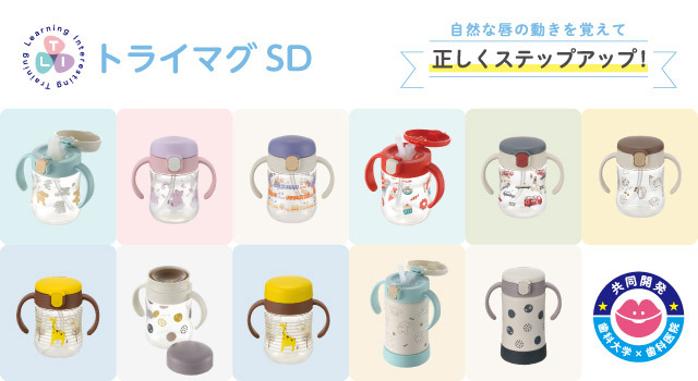 「トライマグSD」シリーズは、赤ちゃんが自然な唇の動きを覚えて、自分で飲み物を飲めるように正しくステップアップできるマグシリーズです。5ヵ月頃からは、幅広の飲み口の「ストローレッスンマグ」で口をすぼめる練習を、7ヵ月頃からは、細めのストロー飲み口の「ストローマグ」で口の閉鎖力を身に付けさせて吸う練習を、8ヵ月頃からは360°どこからでも飲めるコップ飲み口の「コップレッスンマグ」で閉じて飲む練習を、と3ステップで進めることで徐々に唇と舌の動きを鍛えることができます。開発にあたり、歯科大学教授・小児歯科医師にご協力いただきました。