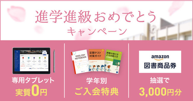 抽選で毎月100名様にAmazon図書商品券プレゼント、学年別には各種入会特典プレゼントや、所定条件でZ会専用タブレットを実質0円で購入できるなど、様々な形で学習を応援する「進学進級おめでとうキャンペーン」を実施中。