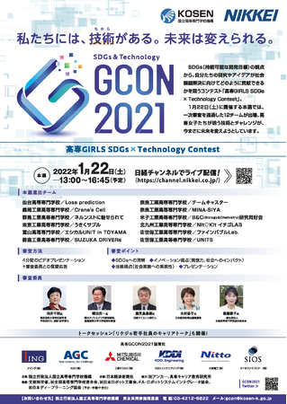 令和4年1月22日(土)の本選(成果発表会)はオンラインで開催し、ビデオプレゼンテーション(4分)と質疑応答を日本経済新聞の映像ポータル「日経チャンネル」で無料配信し、またアーカイブを1年間配信いたします。高専GIRLSが提案する「未来を変えるアイデア」を是非ご覧ください。