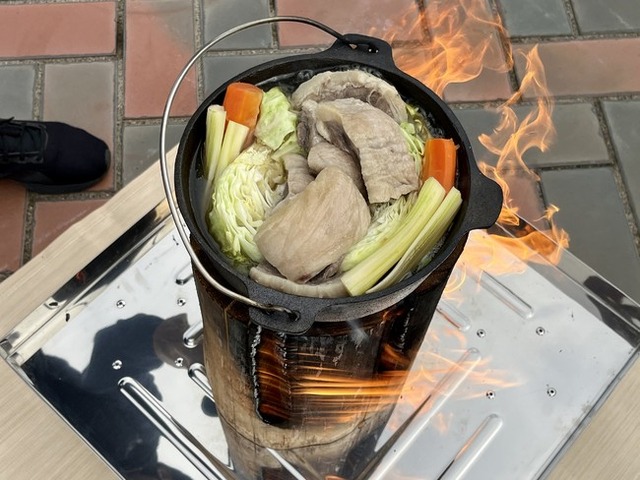 スウェーデントーチの火おこしは薪割りのプロが一から丁寧に教える、キャンプ初心者でも安心のインストラクター付きです。丸太の上にダッチオーブンを置いてつくるポトフのメインには栄養価が高くヘルシーなイノシシのお肉「房総ジビエ」を提供。噛むほどに濃厚な旨味が口いっぱいに広がります。出汁が染み出したポトフの温かいスープにパンを浸してお召し上がりいただけます。