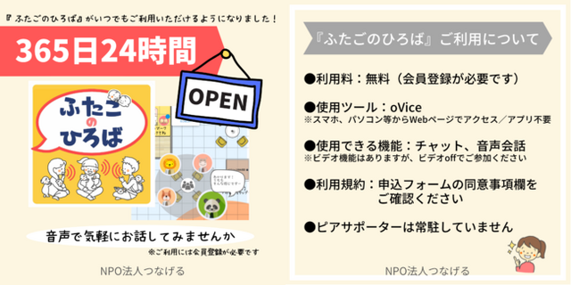 「ふたごのひろば」は24時間ご利用可能ですが、全時間帯につなげるピアサポーターが常駐しているわけではございません。利用規約を必ずご確認いただき、みなさまが思いやりの気持ちを持ちながら、楽しんでいただければと思います。