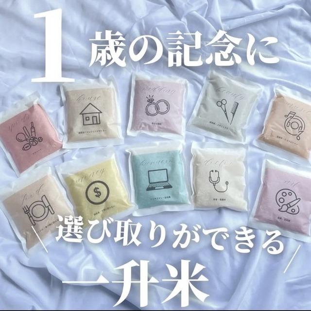 選び取りが出来る一升米には、出生時の思い出がギュッと詰まった可愛い外装袋がついています。1歳になったお子様のとなりに並べて写真を撮るのも良い思い出になります。さらに、1歳のお祝いイベントのメインである一升米を背負う為に選べるカラー風呂敷もセットになっています。風呂敷は、縁を「結ぶ」「包む」などの想いが込められている縁起物です。様々な使い方が出来るので、贈答用にもおすすめです。さらに今回新たに風呂敷に刺繍を入れられます。