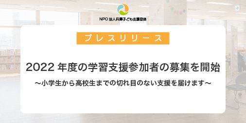 特例認定特定非営利活動法人兵庫子ども支援団体(所在地:兵庫県明石市、代表理事:多田実乘、以下「当法人」という)は、2022年度の学習支援参加者の1次募集を2021年12月21日(火)から2022年1月31日(月)まで行います。2022年度も今年度と同様に、土曜日と日曜日の両日開催いたします。多くの子どもたちに学習の機会を提供し、これからの社会を生き抜くために必要な力を育むことで「夢を諦めることがない社会」の実現やミッションである「子どもが笑って過ごせる地域の形成」を目指します。