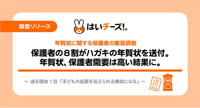 年賀状離れが叫ばれる昨今ですが、8割を超える保護者が年賀状を送っており、子育て世代には年賀状の需要があることが分かる結果となりました。年賀状を送付する保護者のうち、8割が子どもの写真を使用していることからも、子を持つ保護者にとっては子どもの成長を伝えられる良い機会となっていることが分かります。今回の結果から、子どもの有無で年賀状の活用率に違いが出そうなことが予測でき、今後、ハガキでの年賀状送付については子育て世代に向けた、より子どもの成長を伝えられるサービスの需要が高まりそうです。