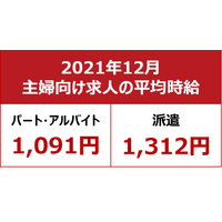 【2021年12月 主婦求人の平均時給】パート・アルバイト:『1,091円』、派遣:『1,312円』