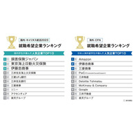 就職希望企業ランキング、【国内就活生】損害保険ジャパンが2年連続人気No1、【海外留学生】はAmazonが初のトップに!