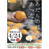 4月24日(日)、足立区の銭湯で「萩夏みかん湯」を楽しもう。山口県萩市の夏みかんとのコラボ企画です。先着順で萩の夏みかんキャンディのプレゼントも。