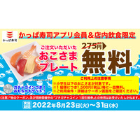 【かっぱ寿司アプリ会員限定】小学生以下のおこさま対象 夏休みにかっぱ寿司からちょっとうれしいプレゼント! 『おこさまプレート』プレゼントキャンペーン開催