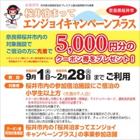 奈良県桜井市内の対象宿泊施設に宿泊する小学生以上の先着8,000名様に5,000円分のクーポン券を配布!