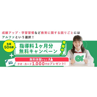 子どもたちの「できた!」を増やす『家庭教師のアルファ』が、今なら1ヶ月分無料!小学生・中学生・高校生の成績アップ・受験対策をおトクに始めるチャンス!