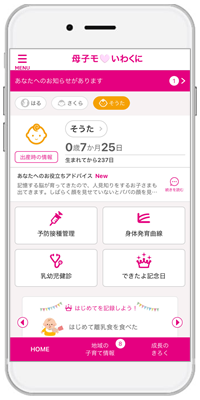 この度、ICTを活用した子育て支援策の更なる充実のため、「母子モ(ハート)いわくに」を導入しました。このアプリでは、市や県からの子育てに関する情報配信や予防接種のスケジュール管理などのサービスが利用できます。
