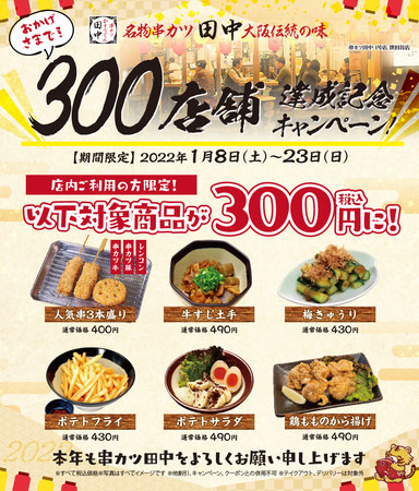 串カツ田中は2008年に第一号店である世田谷店をオープンして以来、お客様や地域の方々に支えられて、このたび記念すべき300店舗出店を達成いたしました。応援してくださった皆さまへこれまでの感謝を伝えたく、「300店舗」にかけたお得なキャンペーンを実施いたします。また、これまで串カツ田中を利用されたことのない方にも来店いただけるきっかけになればと考えております。