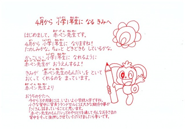 新型コロナの影響により、小学校見学などの行事の機会が減ったことにより、年長児の保護者の方からは小学校入学への準備になかなか意識が向かないという声を多くいただきました。このような状況を受けて、「進研ゼミ小学講座」の「赤ペン先生」が、2022年度入学の全国の新小学1年生を応援できないかという想いから、このたび「『赤ペン先生の問題』無料体験キャンペーン」の実施を決定いたしました。