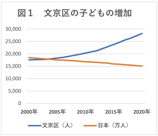 文京区といえば教育が良い地域であると有名でした。しかし、図1のように近年の子ども人口の増加は顕著で、20年で1.6倍以上に増え、教育環境の悪化が始まりました。著者は子育てを通じて、文京区の教育悪化を目の当たりにしました。さらに調査を進めたところ、小学校、保育園、公共施設などに様々な問題点が浮かびあがり、子どもたちが良い教育を受けられていない現状が判明しました。