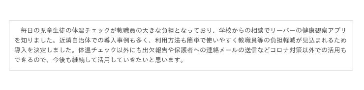 新型コロナウイルスの流行を受けて、多くの学校現場が感染症拡大防止のための体温・体調の集計に苦心しています。利根町は、スマートフォンアプリ・リーバー を利用して体温・体調管理ができる「LEBER for School」を町内の小・中学校4校に導入し、用紙への記入や手渡しなく、家庭から学校へデータを直接送信できる体制を整備しました。