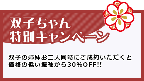 双子の姉妹同時に制約で価格の低い振袖から30%オフで振袖をレンタル&購入できます!!