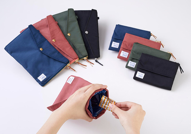 サイズは小物用ポケットがついたスタンダードサイズと、ポケットティッシュケースが付いた二つ折りサイズの2種類で、カラーは人気のくすみカラーを中心としたクロ、カーキ、ピンク、ネイビーの4色展開です。