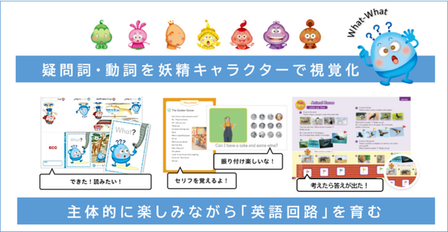 子どもたちが英文を聞く時、名詞ばかり聞き取っているのではないかと感じていました。Where’s~? Do you like~? など文の中には疑問詞や動詞など名詞以外にも大切な要素があることに気づいてもらえるよう、キャラクターとしてビジュアライズしました。こうすることで「りんご」と聞いてそのイメージが湧くのと同じようにWhatと聞けば「何?」と尋ねている妖精キャラクターのWhat-Whatが子どもたちの頭に浮かぶようになります。パイロットクラス※で検証した結果、非常にうまく機能したので採用することにしました。