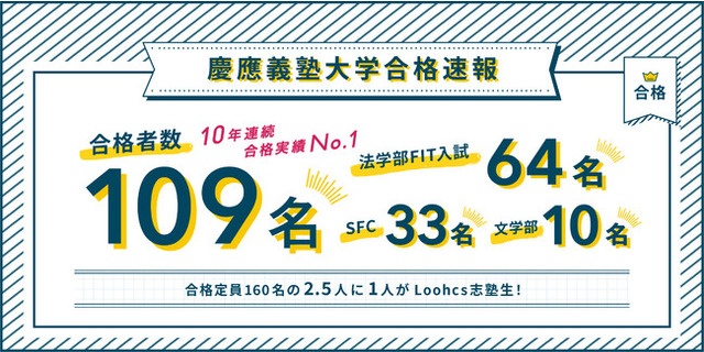 特に、慶應法学部FIT入試は合格定員160名の2.5人に1人(64名)がLoohcs志塾生です!