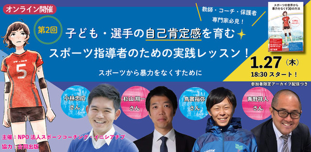 1月27日(木)18:30から「【第2回】子ども・選手の自己肯定感を育む スポーツ指導者のための実践レッスン! スポーツから暴力をなくすために」のオンラインイベントを開催いたします。