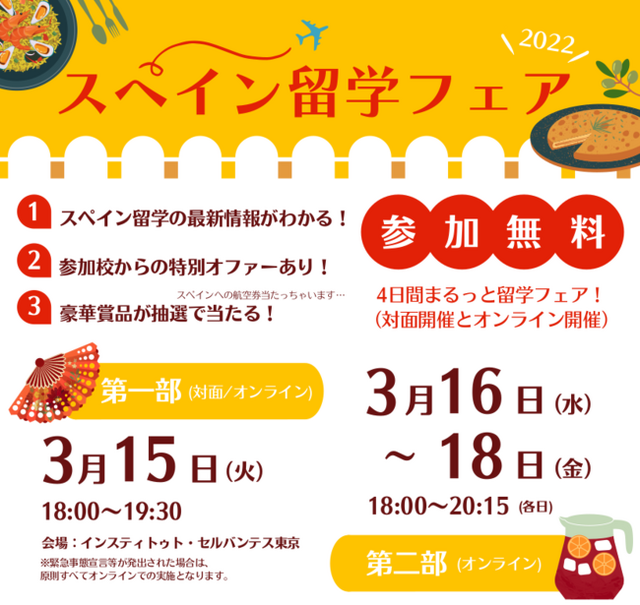 スペインの学校担当者の話が直接聞けて、豪華賞品が抽選であたる、無料の「スペイン留学フェア2022」を3月15日~18日に開催