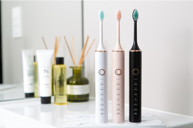 電動歯ブラシ本体は、スタイリッシュな洗面所にも馴染むシンプルなデザインとなり、カラーバリエーションは、白・黒・ピンクの3色展開となっております。また、ブラシの硬さも2種類から選ぶことができ、自分好みの歯ブラシにすることができます。